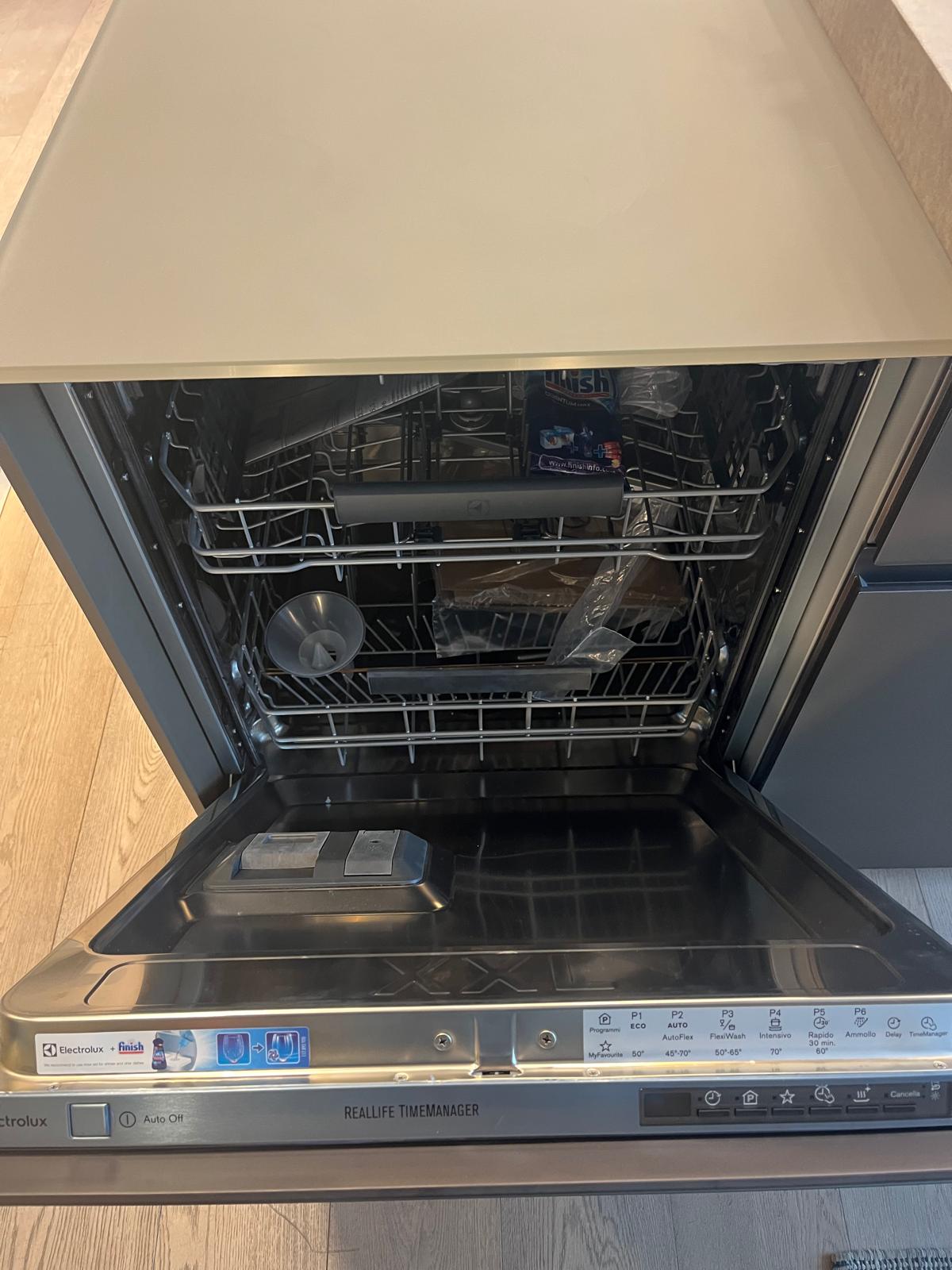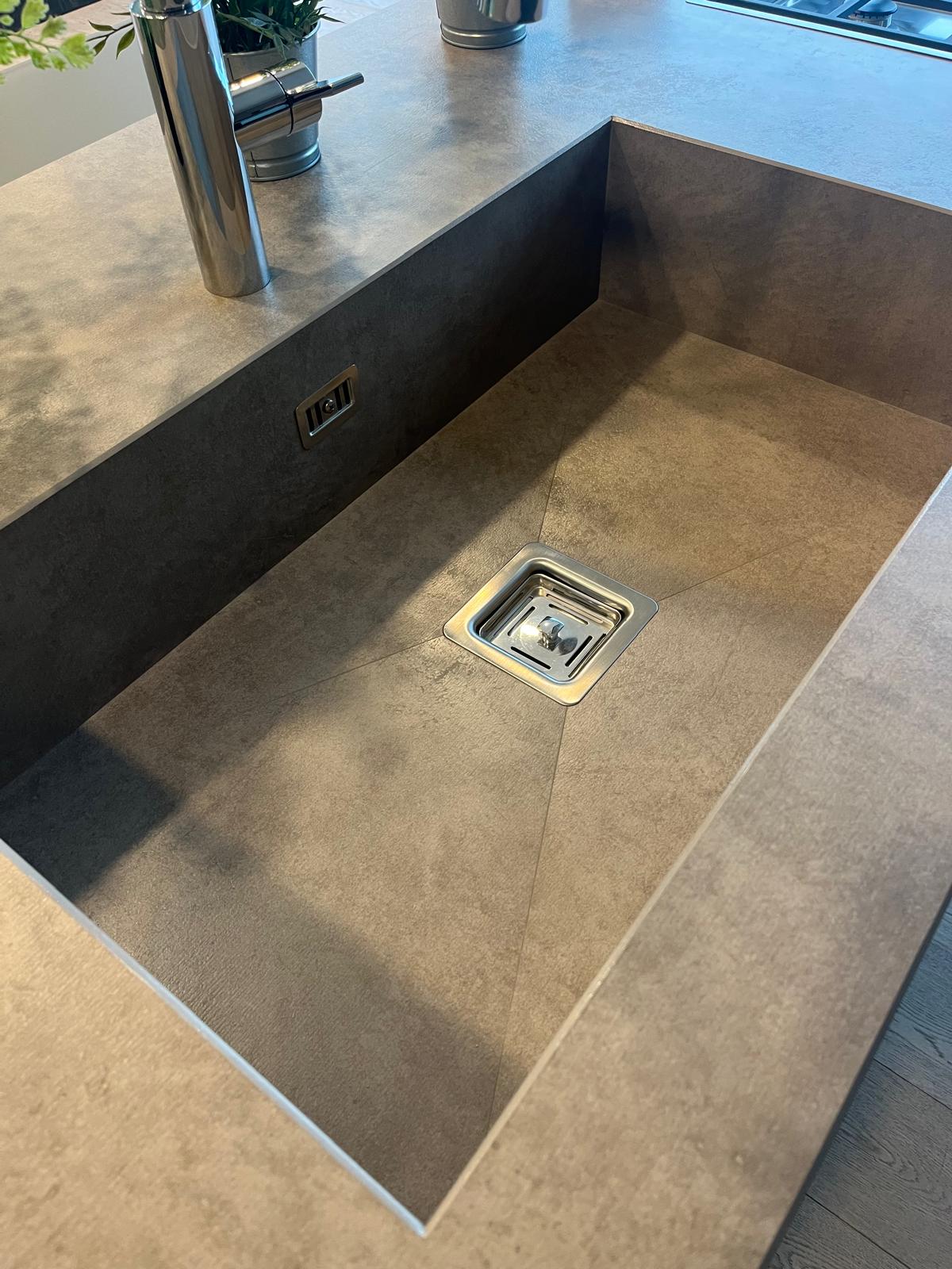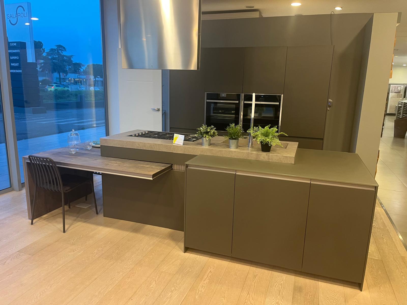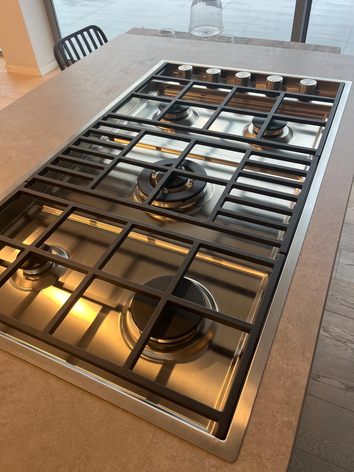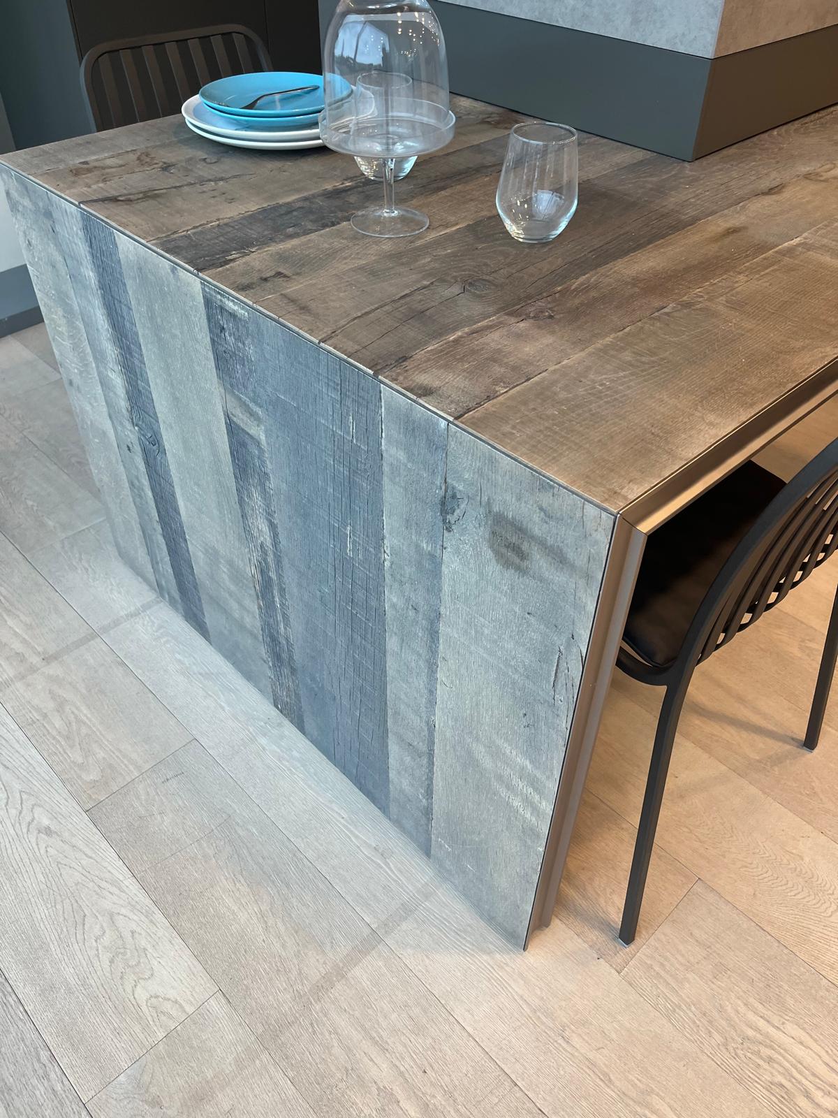 Piano in gres Laminam, ante in vetro, tavolo estraibile in legno di recupero, completa di frigorifero, lavastoviglie, piano cottura.